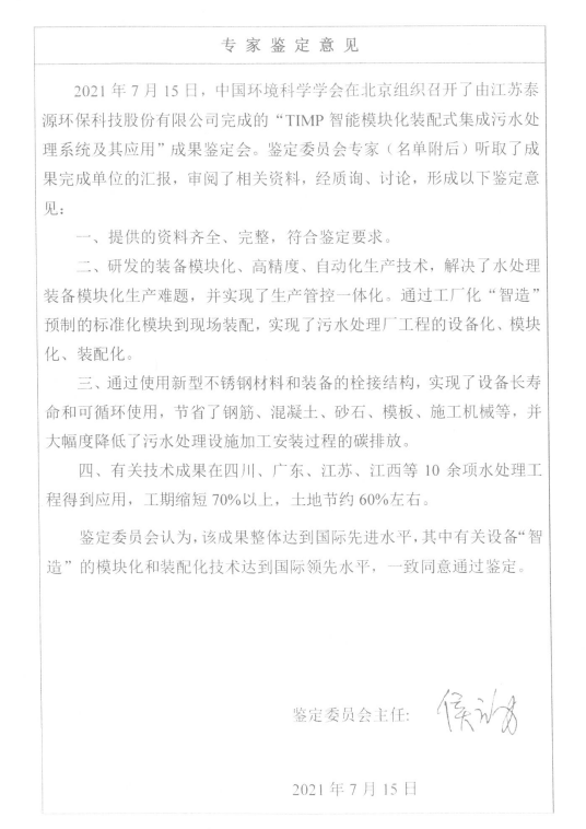 该技术已成功应用在20多个万吨级以上污水处理厂项目中,被鉴定为国际领先水平、国际先进水平,开创了污水厂、净水厂工厂化“智造”新模式,开启了装配式污水厂、净水厂新时代。